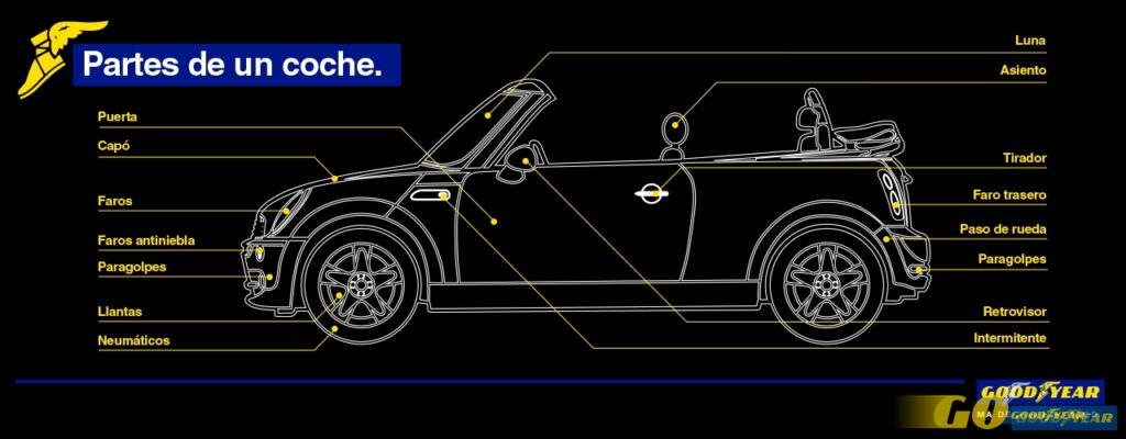 Empezaremos con la parte exterior del coche. El parabrisas es la parte delantera del coche, que se encuentra en la parte superior. El capó es la parte superior del coche, que se encuentra en la parte delantera. El paragolpes es la parte inferior del coche, que se encuentra en la parte delantera. Los faldones son los paneles laterales del coche, que se encuentran en la parte inferior. El techo es la parte superior del coche, que se encuentra en la parte trasera. El maletero es la parte trasera del coche, que se encuentra en la parte inferior. Los espejos laterales son los espejos que se encuentran en los lados del coche.